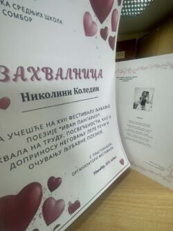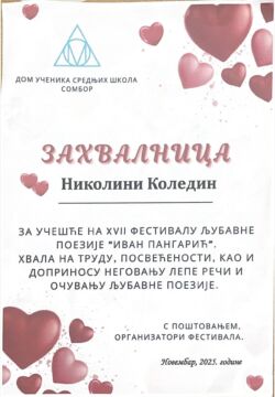 Са поносом делимо вест да је наша ученица Николина Коледин учествовала на XVII Фестивалу љубавне поезије „Иван Пангарић“, на коме је учествовало 37 домова ученика, а пристигло је више од 140 радова младих аутора. За своју песму „Љубав“, Николина је добила захвалницу за труд, посвећеност и допринос неговању лепе речи, а њена песма је објављена у Зборнику радова Фестивала. Њени стихови сведоче о снази емоција, искрености и лепоти писане речи. Честитамо Николини и желимо јој још много инспирације и успеха у даљем стваралаштву!