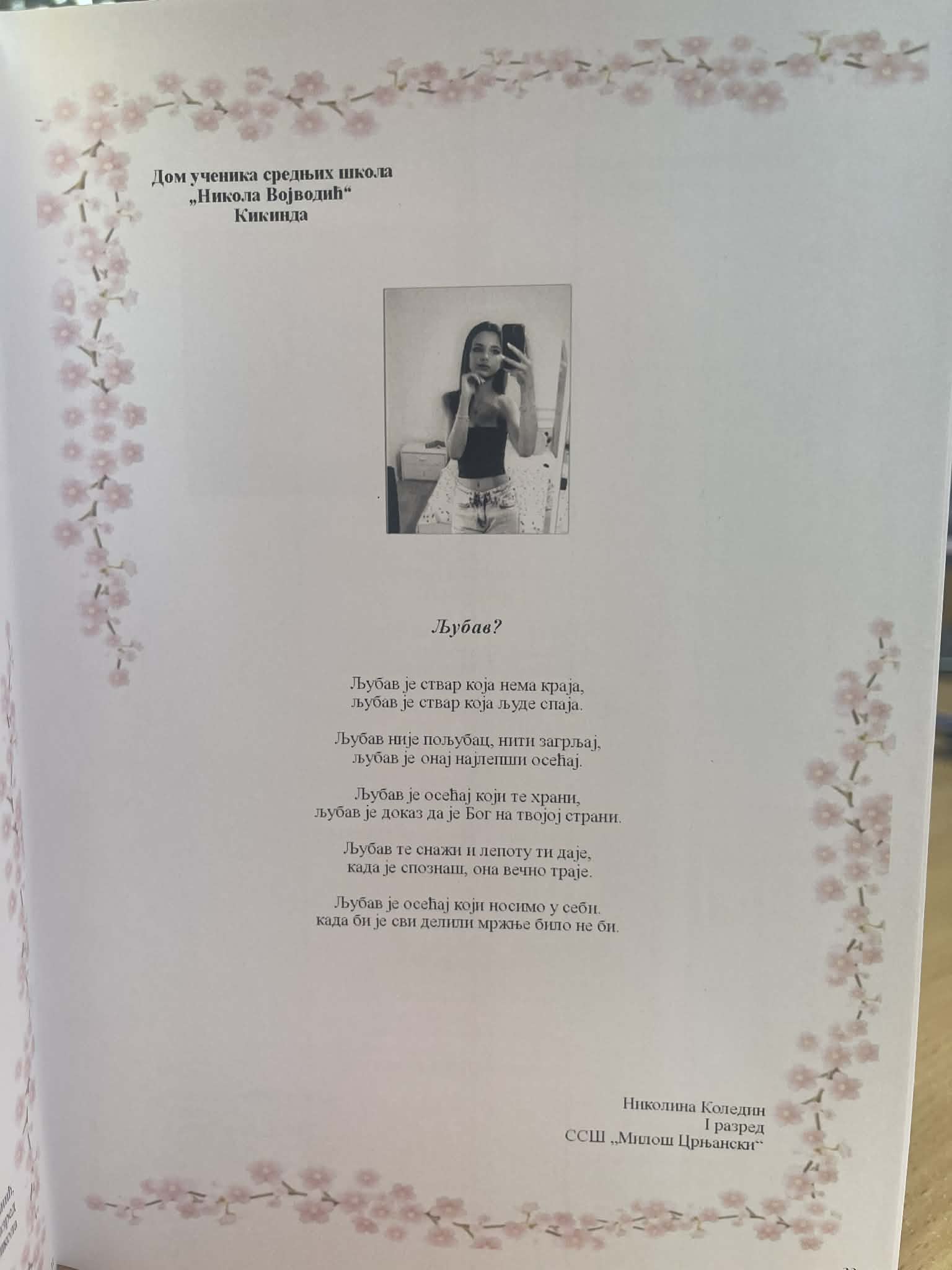 Са поносом делимо вест да је наша ученица Николина Коледин учествовала на XVII Фестивалу љубавне поезије „Иван Пангарић“, на коме је учествовало 37 домова ученика, а пристигло је више од 140 радова младих аутора. За своју песму „Љубав“, Николина је добила захвалницу за труд, посвећеност и допринос неговању лепе речи, а њена песма је објављена у Зборнику радова Фестивала. Њени стихови сведоче о снази емоција, искрености и лепоти писане речи. Честитамо Николини и желимо јој још много инспирације и успеха у даљем стваралаштву!